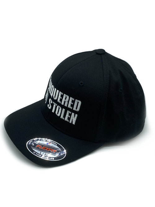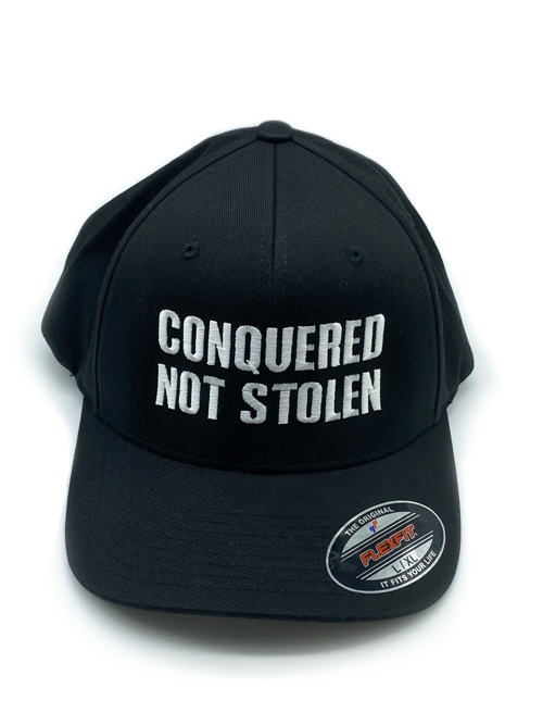 Bold message for a bold patriot. Conquered Not Stolen embroidered on a black flex fit